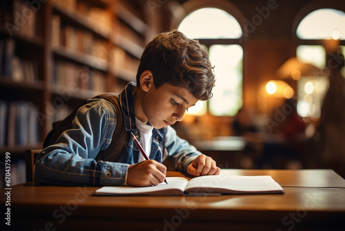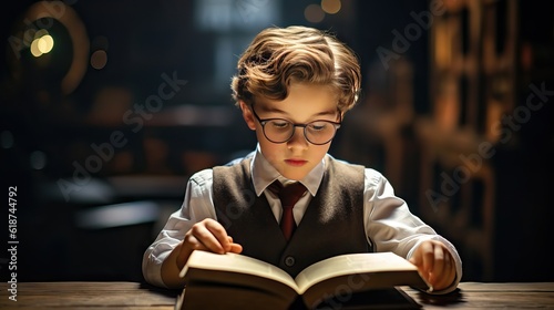 A diligent student with glasses engrossed in reading an educational book. Generative AI.