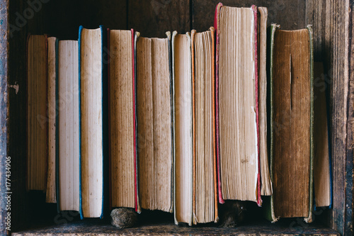 Close up of old hardcover books in a wooden books