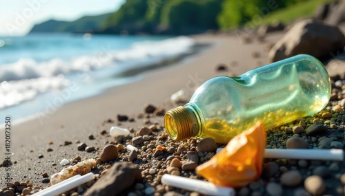Close-up shot of discarded plastic bottles, straws, and food wrappers littering a pristine natural landscape, highlighting the environmental impact of irresponsible waste disposal , nature, grass
