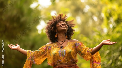 Happy Black Woman With Arms Outstretched in the Air Generative AI