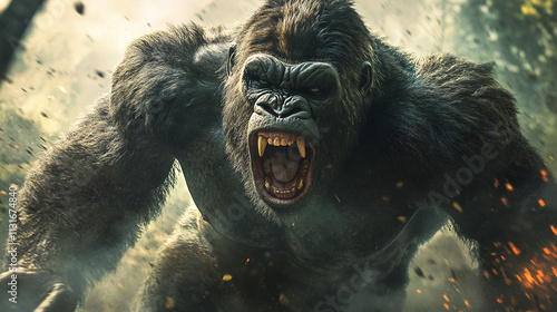 Big angry gorilla animal monster fighter in wildlife jungle or forest, dangerous mad and aggressive king kong, muscular powerful monkey beast.