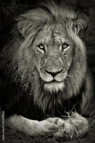 Portrait of a male lion sitting and resting in the Xidulu Private Lodge, Limpopo
