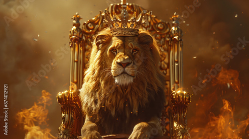 Majestic lion wearing a royal crown sitting on a golden throne surrounded by fire and smoke. Symbol of power, royalty, leadership, strength, king of the jungle, and divine authority.
