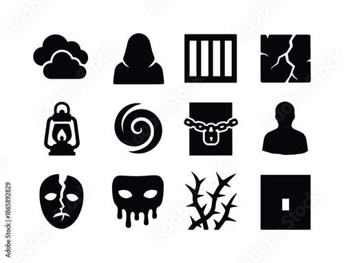 Dark Icon Set. dark, oppressive atmosphere. Solid icon set of dark, oppressive atmosphere: heavy clouds, looming shadow, barred window, cracked wall, dim