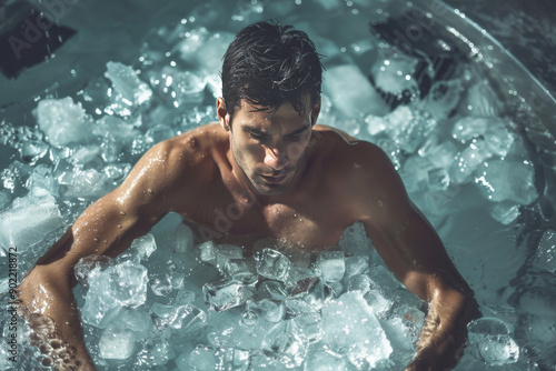 Ice bath recovery - athletic man submerged in ice water, taking a cold plunge to help muscle recovery
