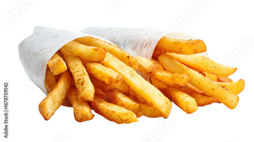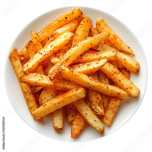 Pile of seasoned potato wedges arranged on a plain white surface view from top