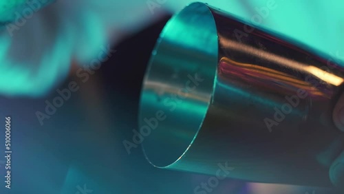The bartender puts ice in the shaker in beautiful lighting. Bartender prepares cocktail with ice