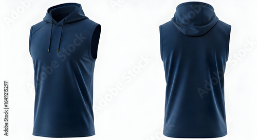 Dark blue sleeveless athletic hoodie for workouts outdoor activities or casual comfort. Ideal for training gym sessions and active living. Black sleeveless tank top front and back view on transparent background, PNG