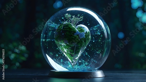 A visually striking digital artwork showcasing a vibrant, heart-shaped Earth ensconced within a crystalline globe, embodying ecological preservation and a hopeful tomorrow