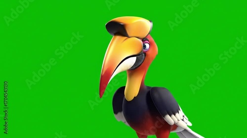 A vibrant 3D cartoon hornbill stands against a green screen background, showcasing its distinctive large beak and colorful plumage in a visually striking close-up.